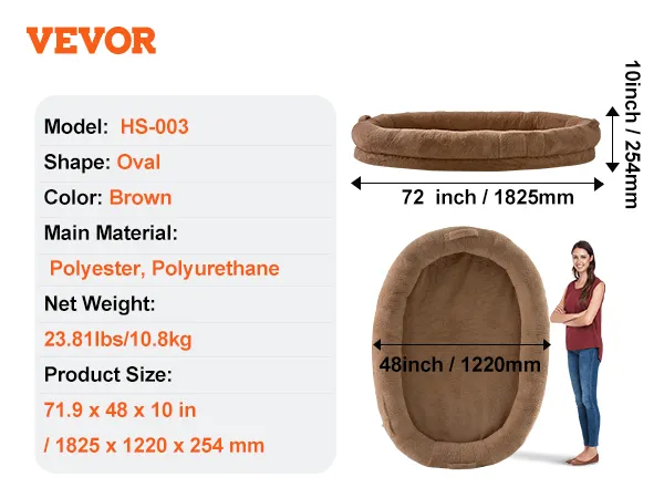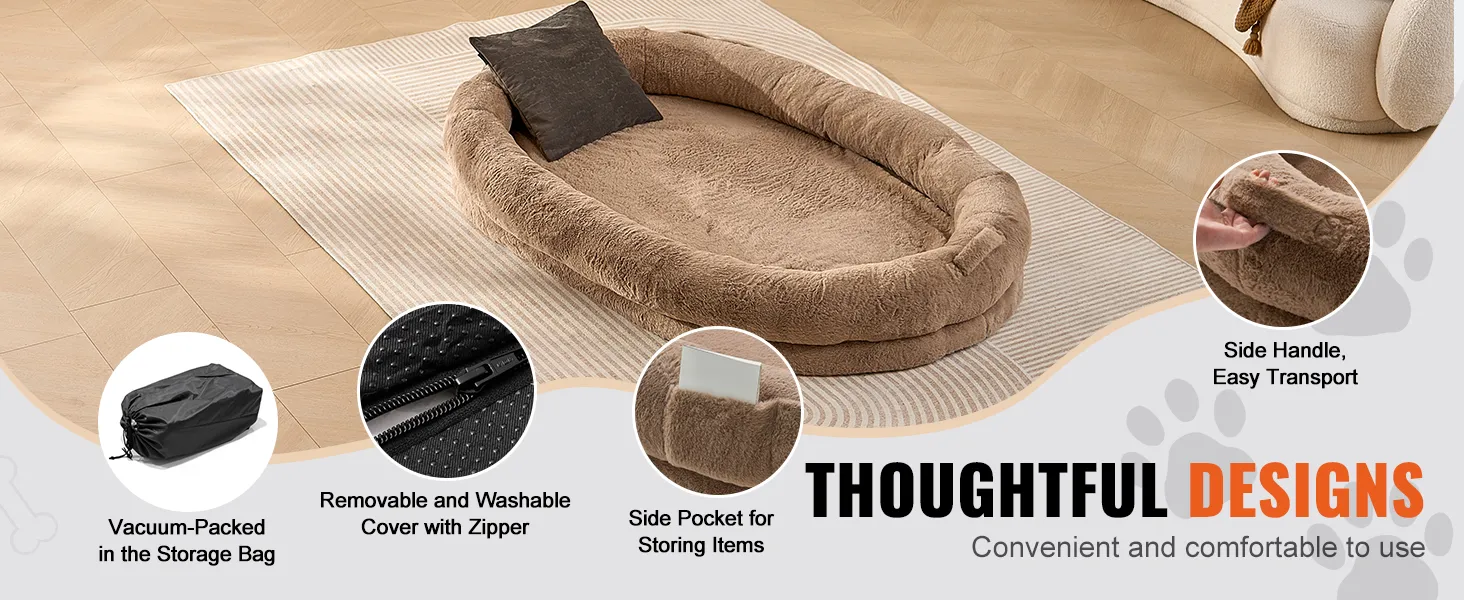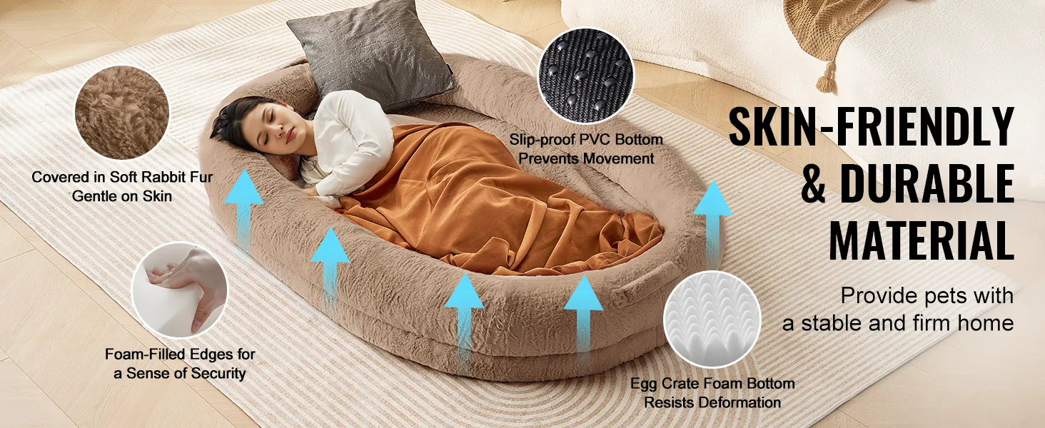 VEVOR Hondenbed voor Mensen, 183 x 122 x 25 cm, Hondenbed voor Volwassene, Hondenbed op Mensenmaat met Wasbare Hoes van Kunstkonijnenbont, Orthopedisch Ei-schuim, Opbergzak, Groot Bonenbed voor Honden, Bruin