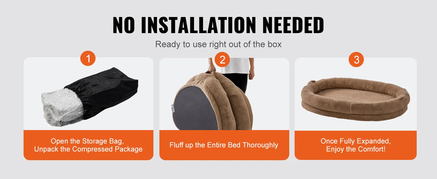 Geen montage nodig! Het hondenbed op mensenformaat is direct uit de doos klaar voor gebruik nadat het zijn vorm heeft teruggekregen.