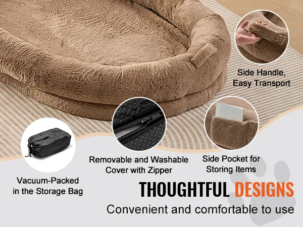 Draagbaar en praktisch: het hondenbed op menselijke maat is voorzien van handgrepen aan de zijkant en een opbergtas voor eenvoudig transport. Zijzakken bieden handige opbergruimte voor telefoons, boeken en meer. Na gebruik verpak je hem vacuüm in de opbergtas en plaats je hem overal in huis, van de slaapkamer tot de woonkamer, speelkamer of studeerkamer.
