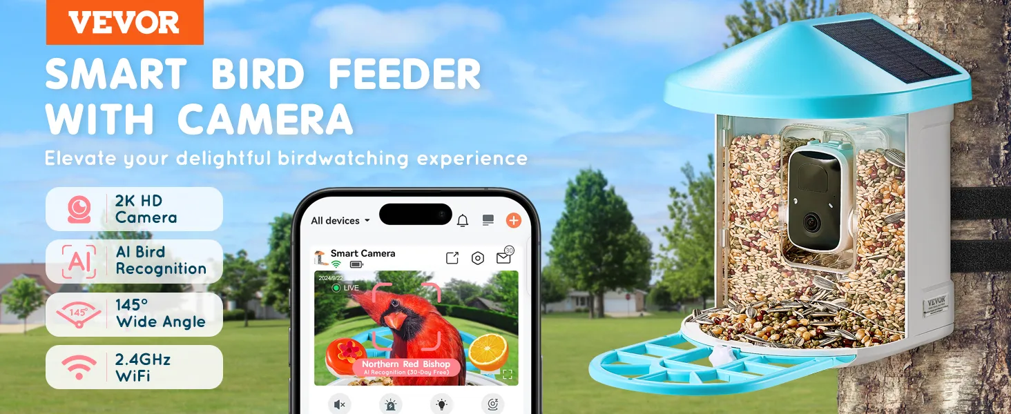 AI identificeert meer dan 10.000 vogelsoorten: de VEVOR slimme vogelvoeder met camera beschikt over een geavanceerd AI-detectiesysteem (proefperiode van 30 dagen) dat meer dan 10.000 vogelsoorten kan identificeren. Het registreert en identificeert automatisch elke vogel die op bezoek komt en waarschuwt u onmiddellijk via de telefoonapp.