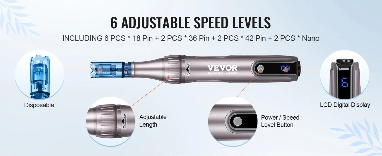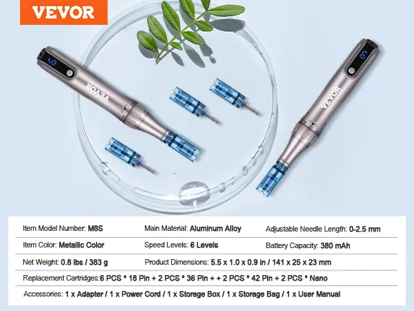 Reveal Your Radiance: VEVOR M8S professional microneedling pen effectively improves skin tissue, boosts product absorption, lightens scars and age spots, and enhances skin elasticity. It comes with 6 pcs * 18 pin + 2 pcs * 36 pin + + 2 pcs * 42 pin + 2 pcs * nano anti-backflow cartridges for replacement, ideal for treating acne scars, yellowish spots, pigmentation issues, wrinkles, and daily skin care.