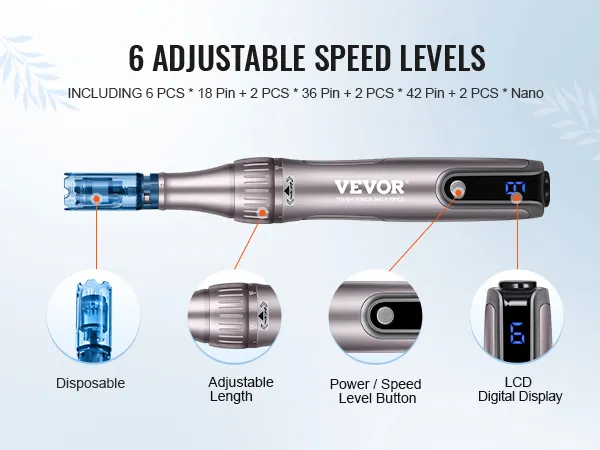 Our microneedling system features 6 adjustable speed to accommodate various treatment needs, with LCD display for intuitive speed level control. The adjustable needle lengths, ranging from 0 to 2.5 mm, allow you to tailor your treatment for optimal results.