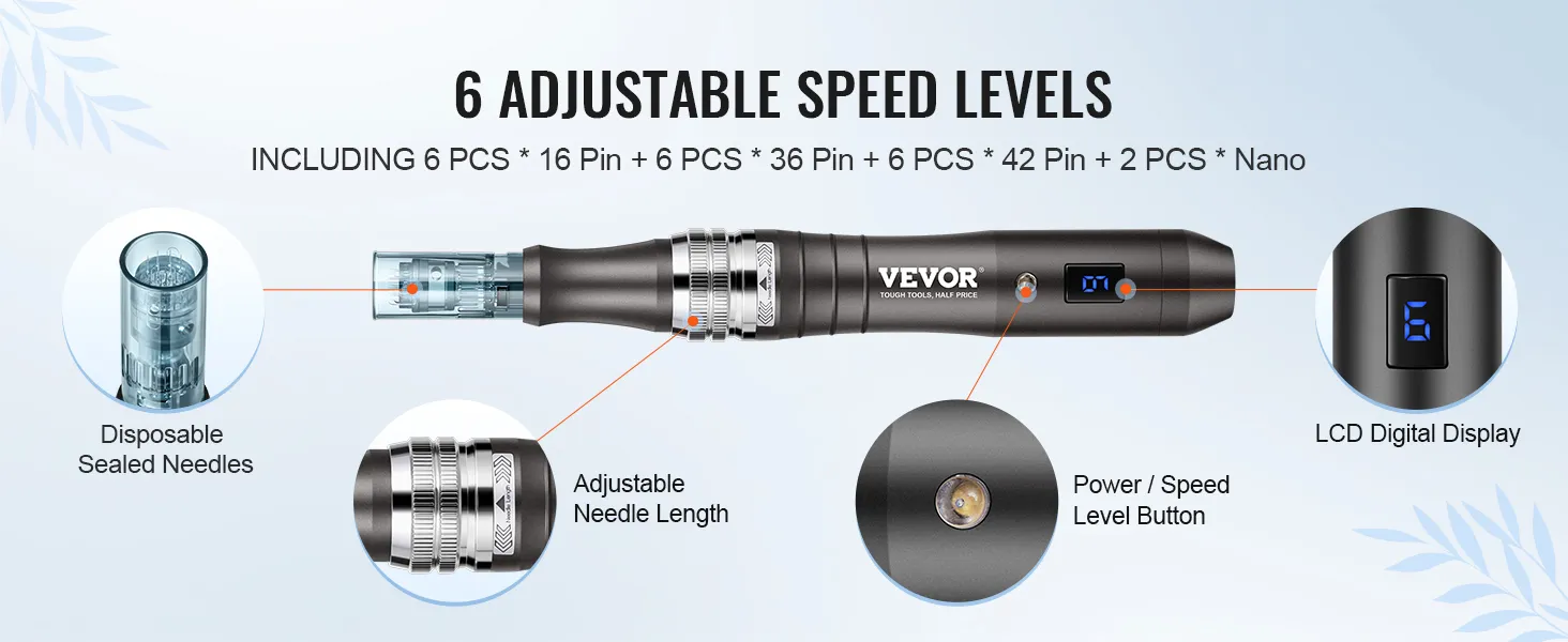 Reveal Your Radiance: VEVOR professional microneedling pen effectively improves skin tissue, boosts product absorption, lightens scars and age spots, and enhances skin elasticity. It comes with 6 pcs * 16 pin + 6 pcs * 36 pin + + 6 pcs * 42 pin + 2 pcs * nano professional cartridges for replacement, ideal for treating acne scars, yellowish spots, pigmentation issues, wrinkles, and daily skin care.
