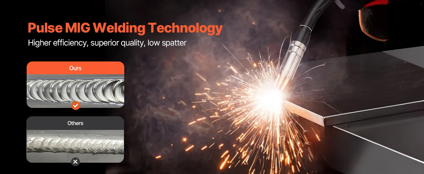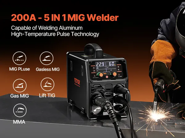5 in 1 MIG-lasser: Deze 200A 5 in 1 Pro MIG-lasser ondersteunt verschillende functies: MIG Pluse, Gasless MIG, Gas MIG, MMA en Lift TIG. De innovatieve pulslasfunctie zorgt voor snelle, hoogwaardige lassen met weinig spat en een betere warmtecontrole dan conventionele MIG-lasapparaten, waardoor perfecte lassen bij lagere temperaturen mogelijk zijn (Let op: aluminium lastoorts is niet inbegrepen en moet apart worden aangeschaft; Lift TIG-toorts niet inbegrepen)