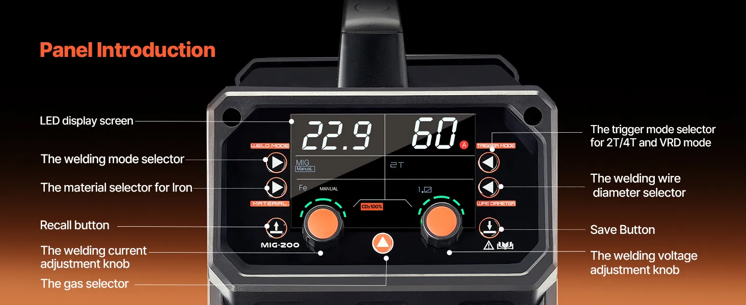 Het MIG-lasapparaat is voorzien van een LCD-scherm met een duidelijk en intuïtief bedieningspaneel voor eenvoudige en nauwkeurige parameterinstellingen. Het helpt u om snel aan de slag te gaan, verbetert de lasefficiëntie en zorgt voor een soepelere gebruikerservaring.