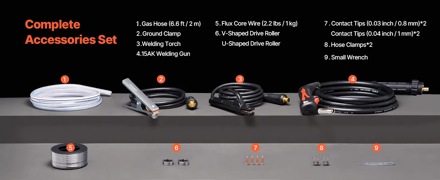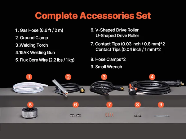 Compatibiliteit met flexibele draad: onze MIG-lasser is compatibel met gevulde draad, gasgevulde draad en aluminiumdraad, met een maximale draadcapaciteit van 5 kg. Geschikt voor gevulde draad en massieve draad met 0,03" (0,8 mm) en 0,04" (1,0 mm), aluminiumdraad met 0,04" (1,0 mm) en 0,05" (1,2 mm)