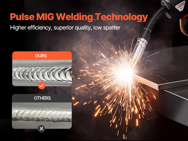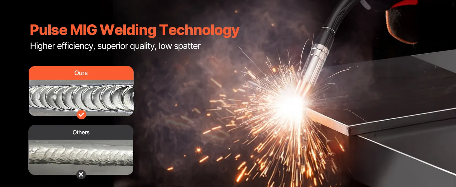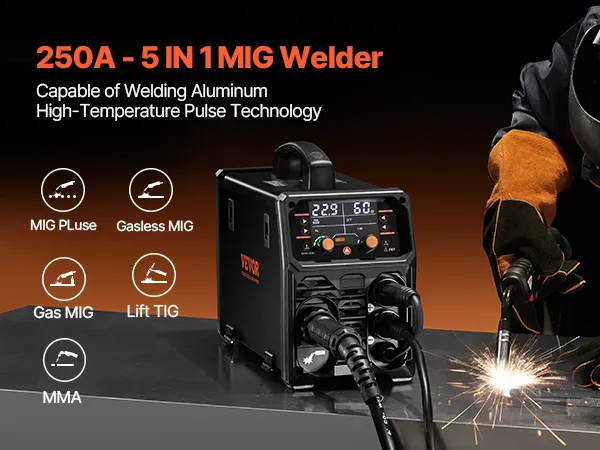 5 in 1 MIG-lasser: Deze 250A 5 in 1 Pro MIG-lasser ondersteunt verschillende functies: MIG Pluse, Gasless MIG, Gas MIG, MMA en Lift TIG. De innovatieve pulslasfunctie zorgt voor snelle, hoogwaardige lassen met weinig spat en een betere warmtecontrole dan conventionele MIG-lasapparaten, waardoor perfecte lassen bij lagere temperaturen mogelijk zijn (Let op: aluminium lastoorts is niet inbegrepen en moet apart worden aangeschaft; Lift TIG-toorts niet inbegrepen)