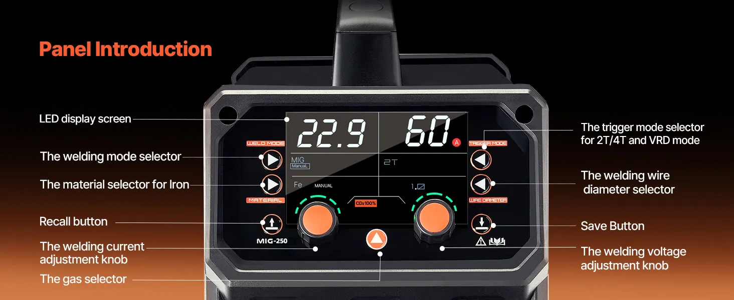Deze 5-in-1 250 ampère Pro MIG-lasser combineert veelzijdigheid, kracht en intelligentie. Het ondersteunt meerdere lasfuncties: MIG Pluse, gasloos MIG, gas MIG, MMA en lift TIG.