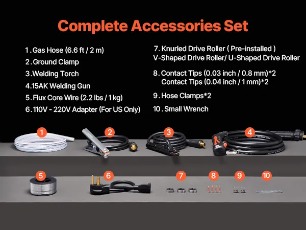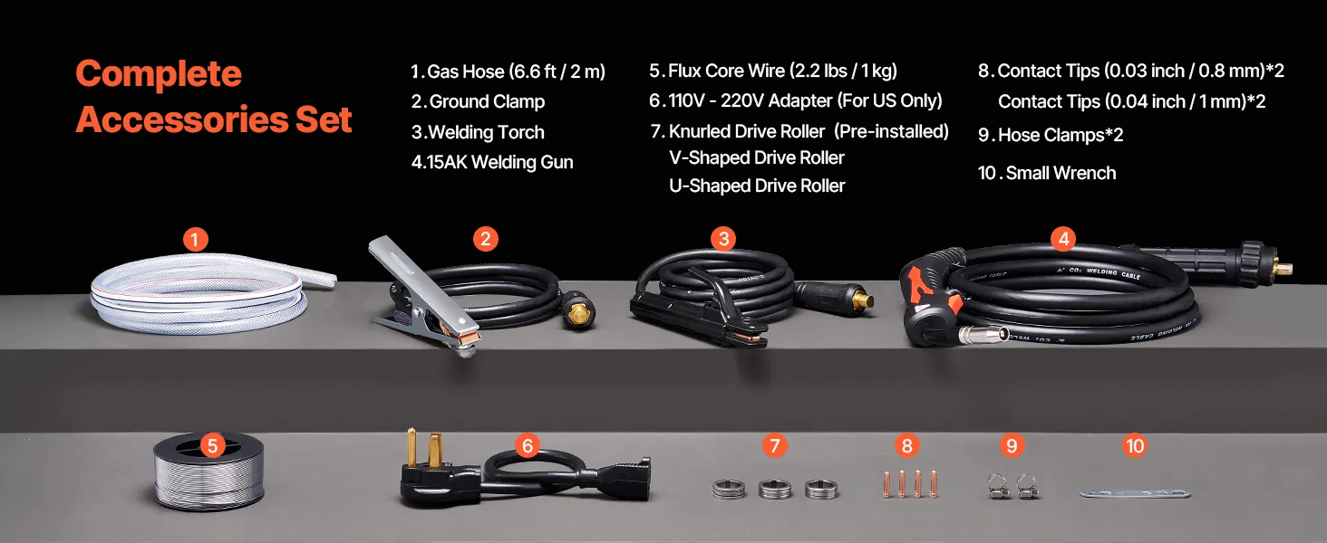 Compatibiliteit met flexibele draad: onze MIG-lasser is compatibel met gevulde draad, gasgevulde draad en aluminiumdraad, met een maximale draadcapaciteit van 5 kg. Geschikt voor gevulde draad en massieve draad met 0,03" (0,8 mm) en 0,04" (1,0 mm), aluminiumdraad met 0,04" (1,0 mm) en 0,05" (1,2 mm)