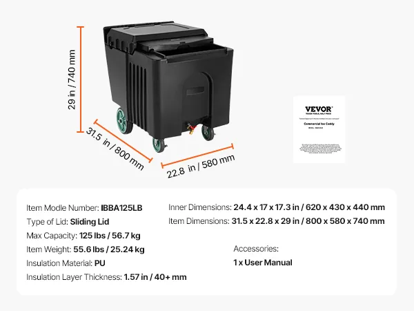 Large Capacity Storage: With internal dimensions of 24.4 x 17 x 17.3 in (620 x 430 x 440 mm), our commercial ice bin provides a generous 125 lbs / 56.7 kg capacity, meeting all your cooling needs for any occasion