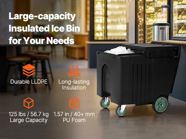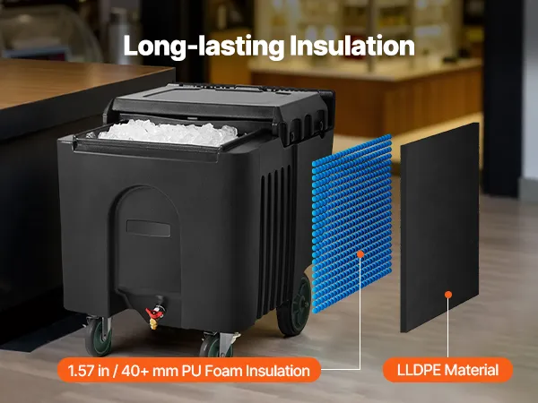 Boasting a 125 lbs / 56.7 kg large capacity, our commercial ice bin combines superior insulation with convenient functionality. Made with LLDPE material for durability and includes a 1.77 in (45 mm) PU insulation layer, it delivers 24-hour cooling efficiency for your ice storage needs.