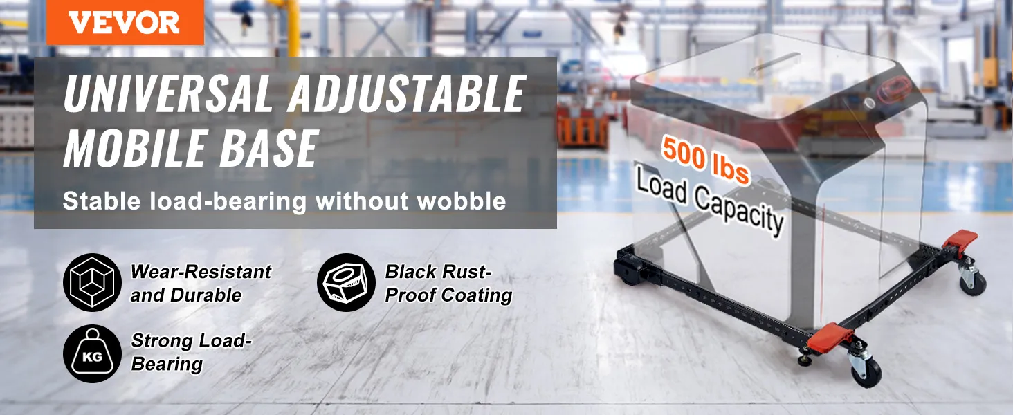 Whether you're dealing with square or rectangular machinery, this heavy-duty mobile base adjusts in length and width. Perfect for industrial lines, storerooms, or your garage.