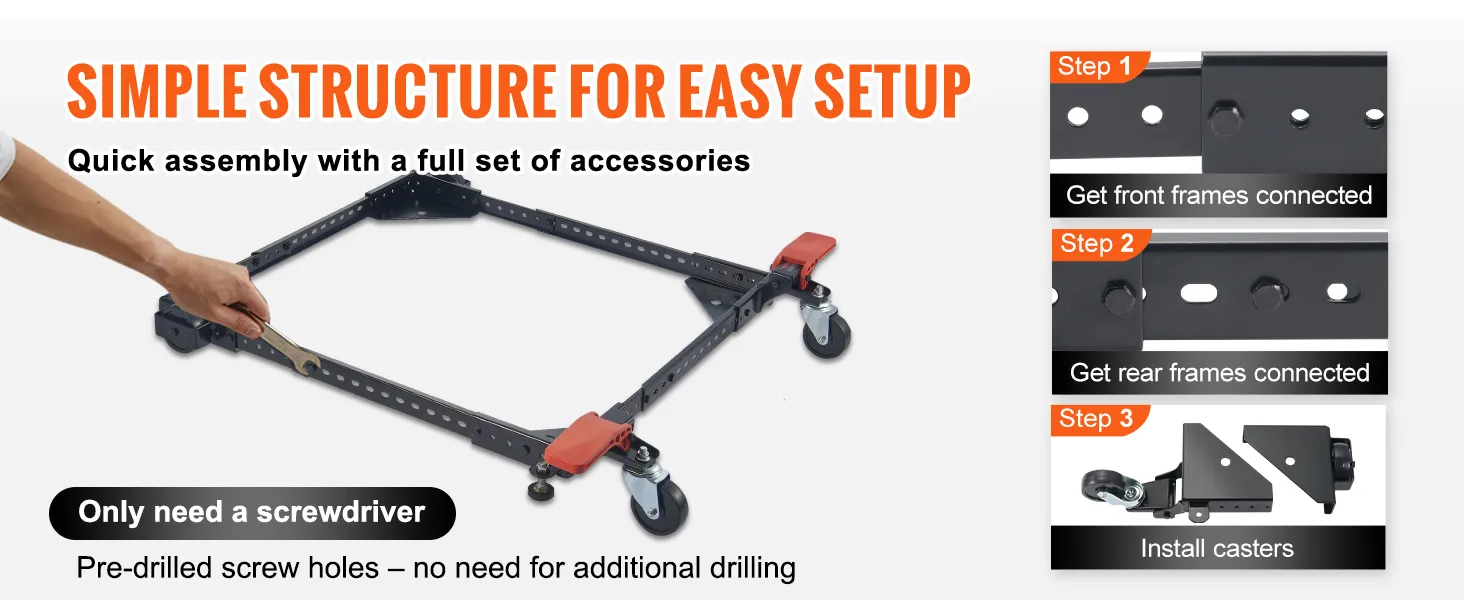 No Tools, No Tears: Leave the toolbox gathering dust. Our heavy-duty universal mobile base snaps together with minimal fuss. Whether you're a DIY enthusiast or someone who can't even pronounce 'hex wrench,' you'll get it set up in no time.