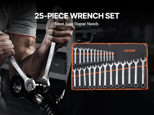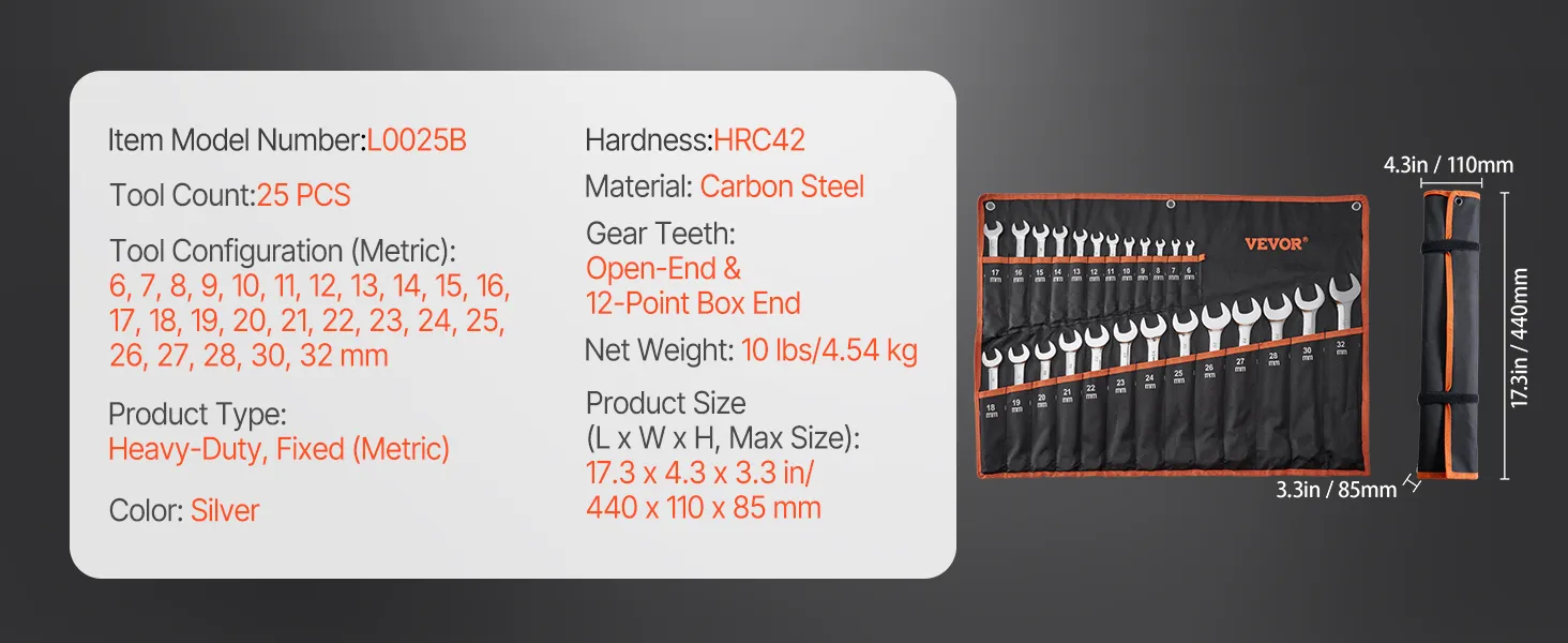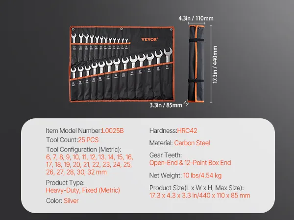 VEVOR Combination Wrench Set, 25-Piece Open End Wrench Set with Roll-up Pouch, Carbon Steel Wrench Set Metric 6 mm to 32 mm, Ideal for General Household, Garage, Workshop, Auto Repairs, Emergency