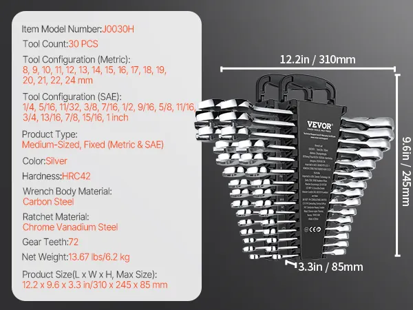 VEVOR-sleutelset 30-delige ratelsleutelset met opbergrek, sleutelset van Cr-V-staal SAE 1/4 tot 1 inch, metrisch 8 tot 24 mm, ideaal voor algemeen huishouden, garage, werkplaats