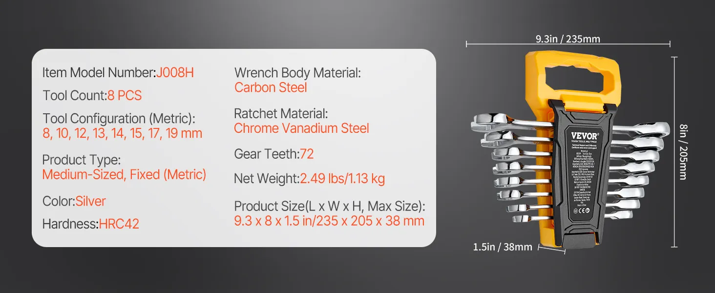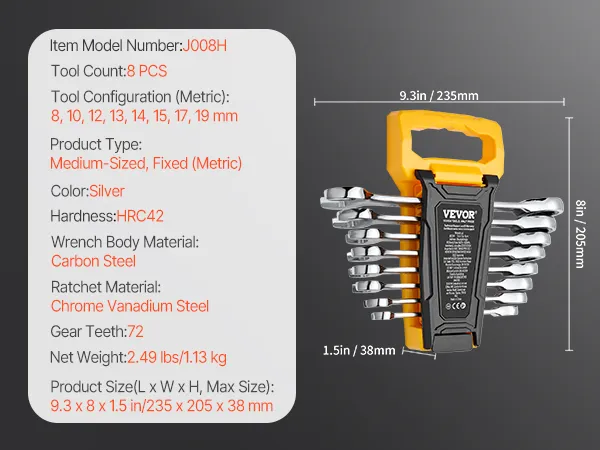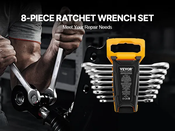VEVOR Combination Wrench Set, 8-Piece Ratcheting Wrench Set with Organizer Rack, Cr-V Steel Wrench Set Metric 8 mm to 19 mm, Ideal for General Household, Garage, Workshop, Auto Repairs, Emergency