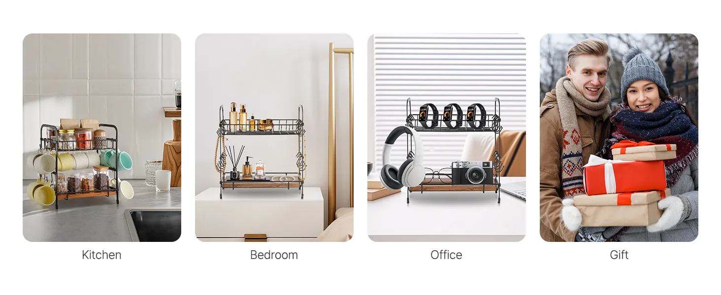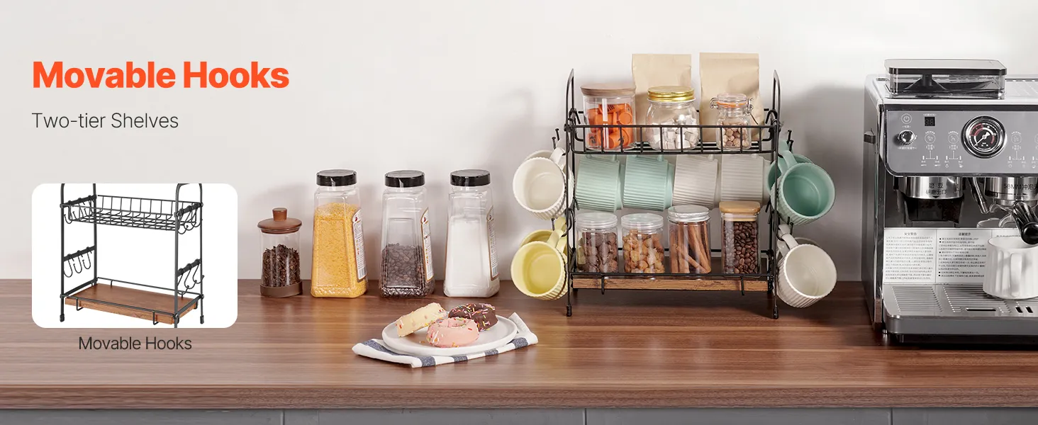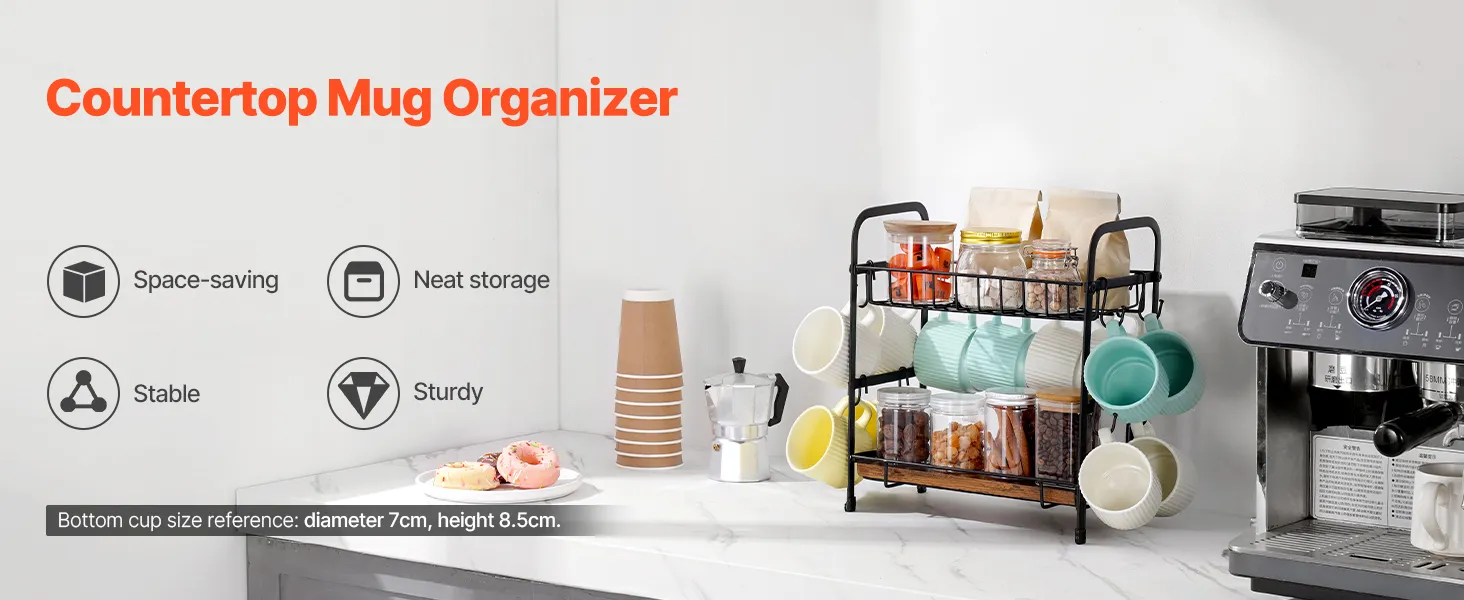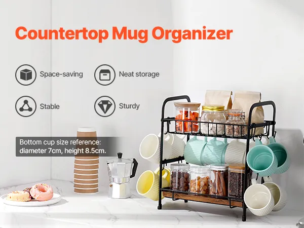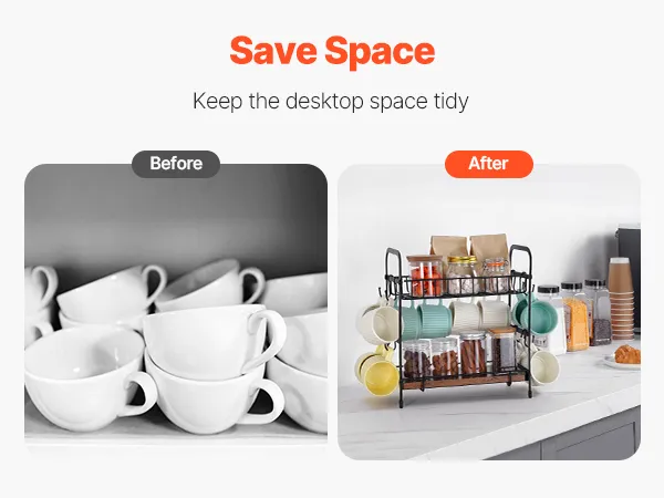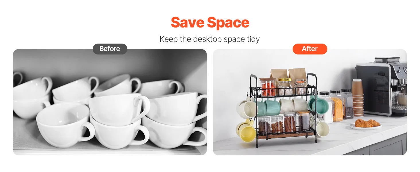 The two-tier coffee bar organizer helps you make the most of your space, and freely place it in your office, kitchen, or home. It aids in organizing and storing coffee mugs, as well as accessories and more items, keeping your counter neat and orderly.