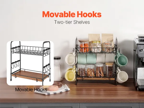 Multi-functional Organizer: The coffee bar organizer features 12 adjustable hooks and two-tier shelves, providing ample space for various items such as coffee beans, tea, sugar, creamer, stirrers, snacks, and more