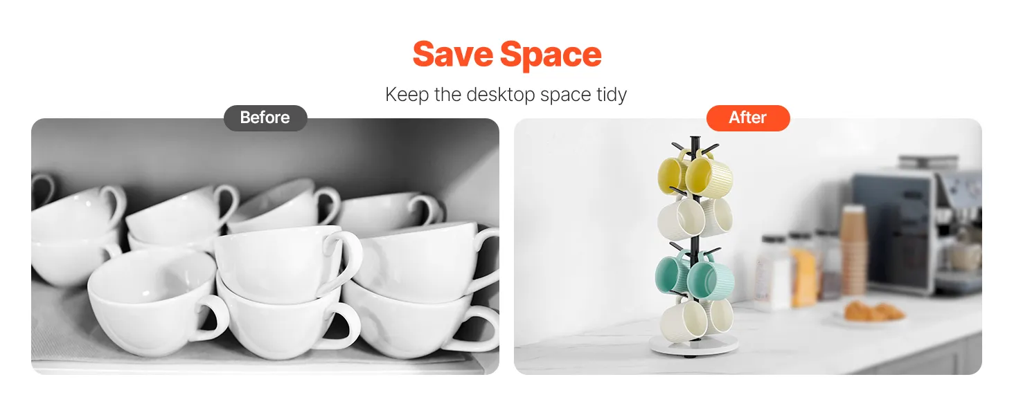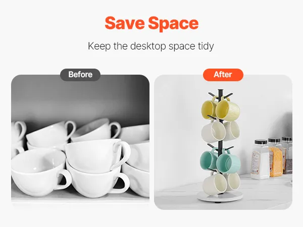 Space Saving: The coffee mug tree is compact and takes up minimal space while keeping things organized and freeing up valuable countertop space