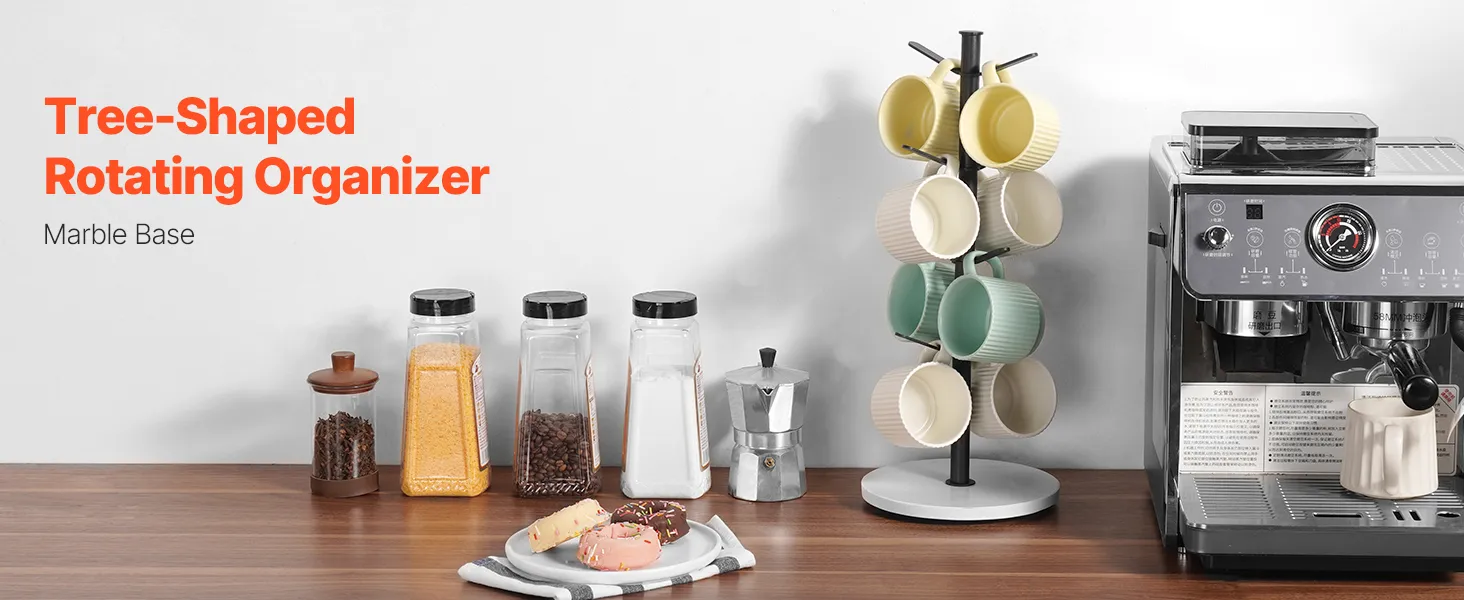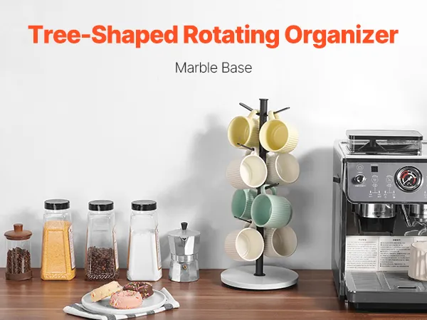 Mug Holder Tree: This mug tree can hold up to 8 coffee mugs. The tree design is not only practical but also visually appealing, featuring a beautiful marble base that doubles as a decoration for your kitchen, enhancing its aesthetics