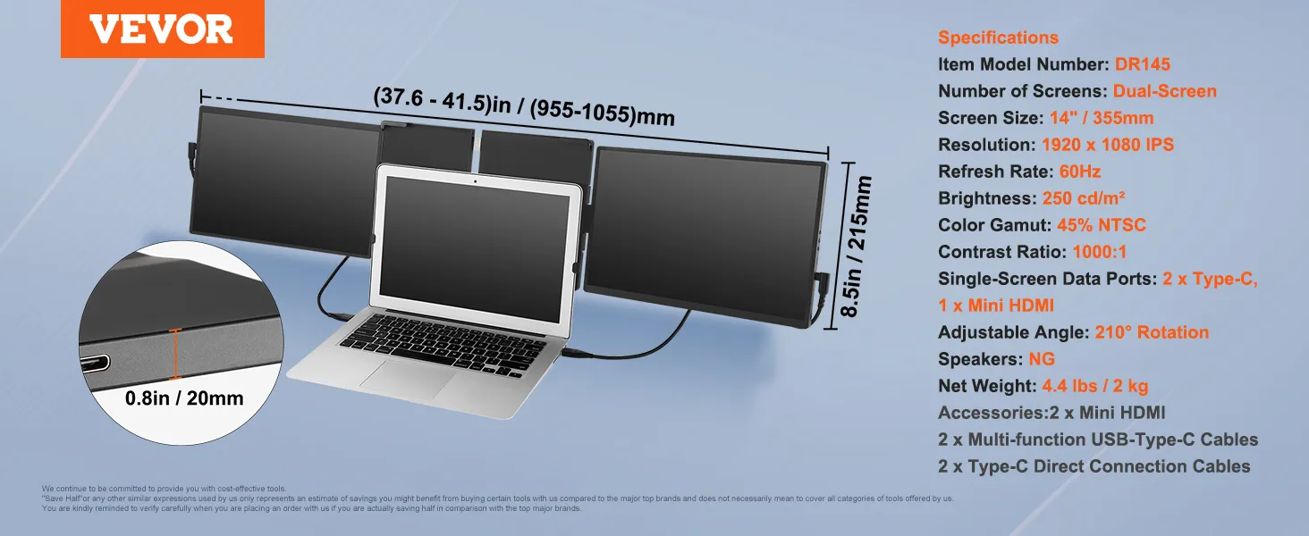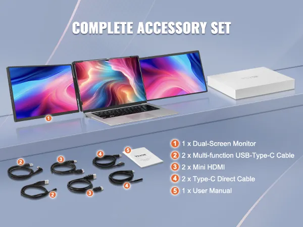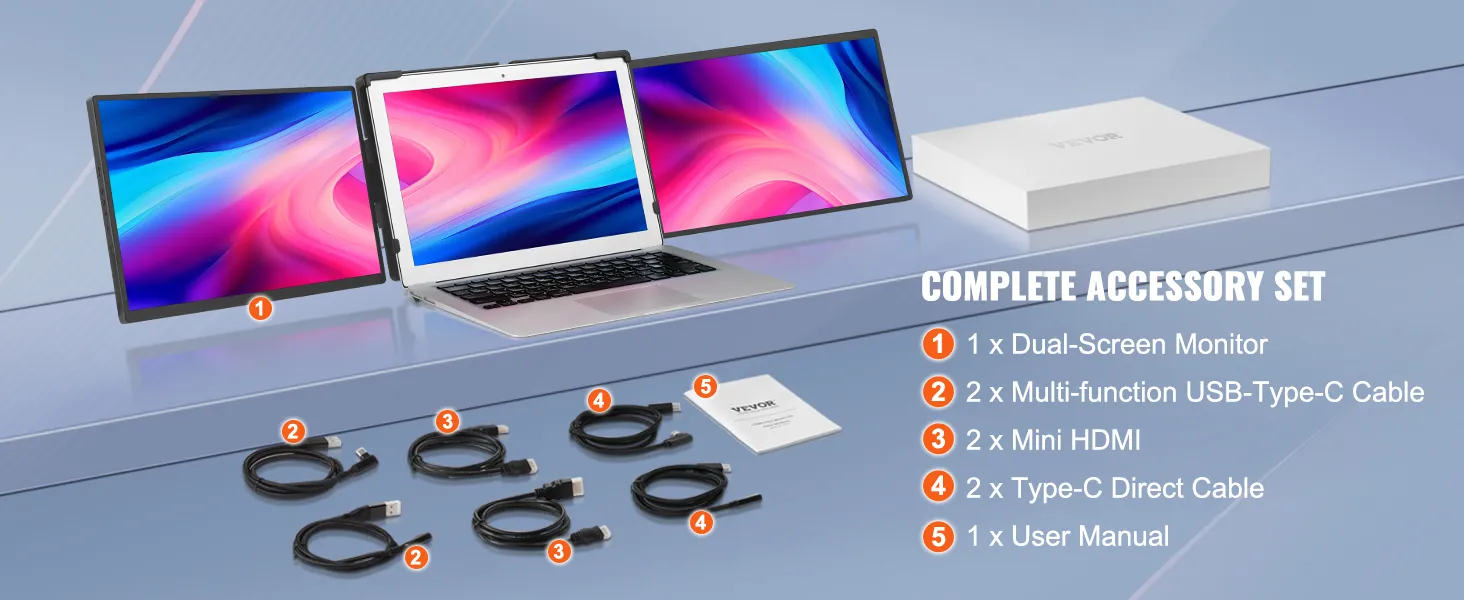 Inclusief alle benodigde accessoires: 2 mini-HDMI-kabels, 2 multifunctionele USB Type C-kabels en 2 Type C-kabels voor directe aansluiting. Met een gewicht van slechts 2 kg kunt u met de VEVOR-monitor voor laptopschermen overal efficiënt werken.