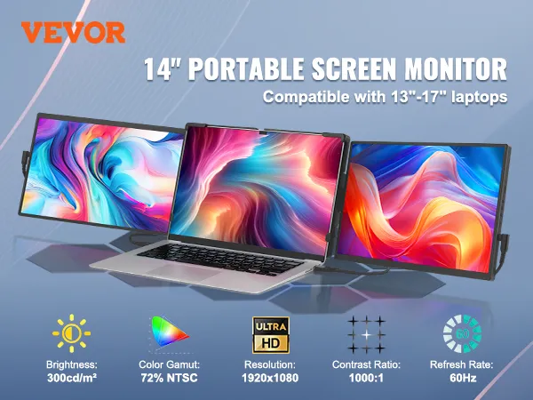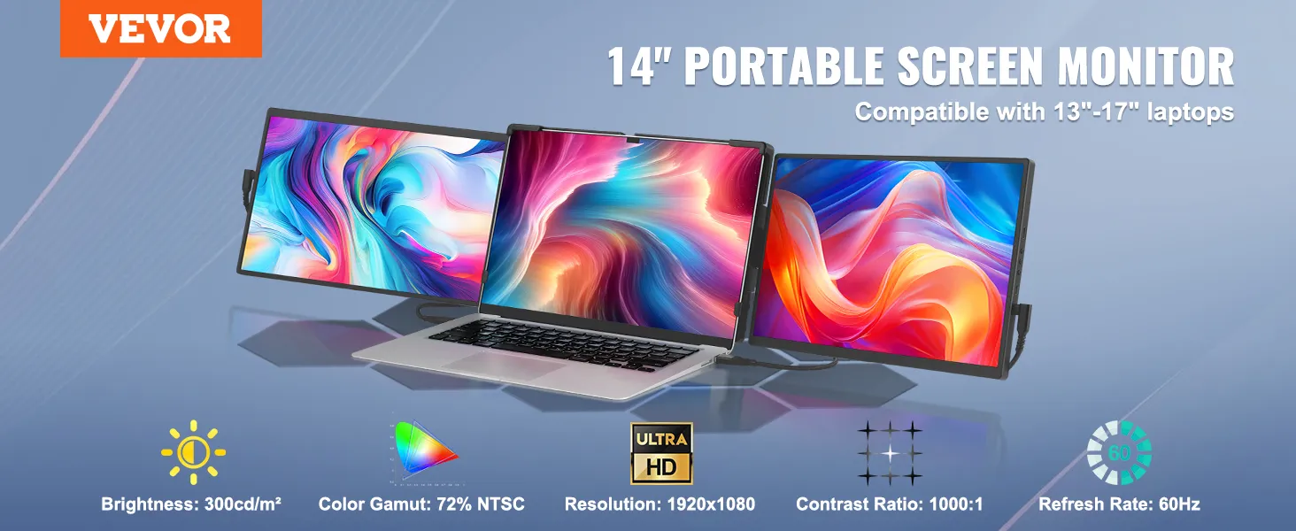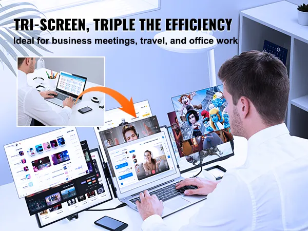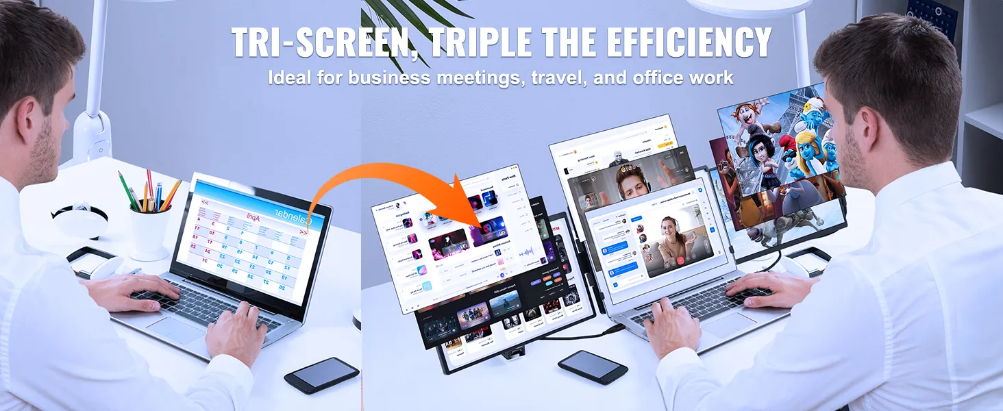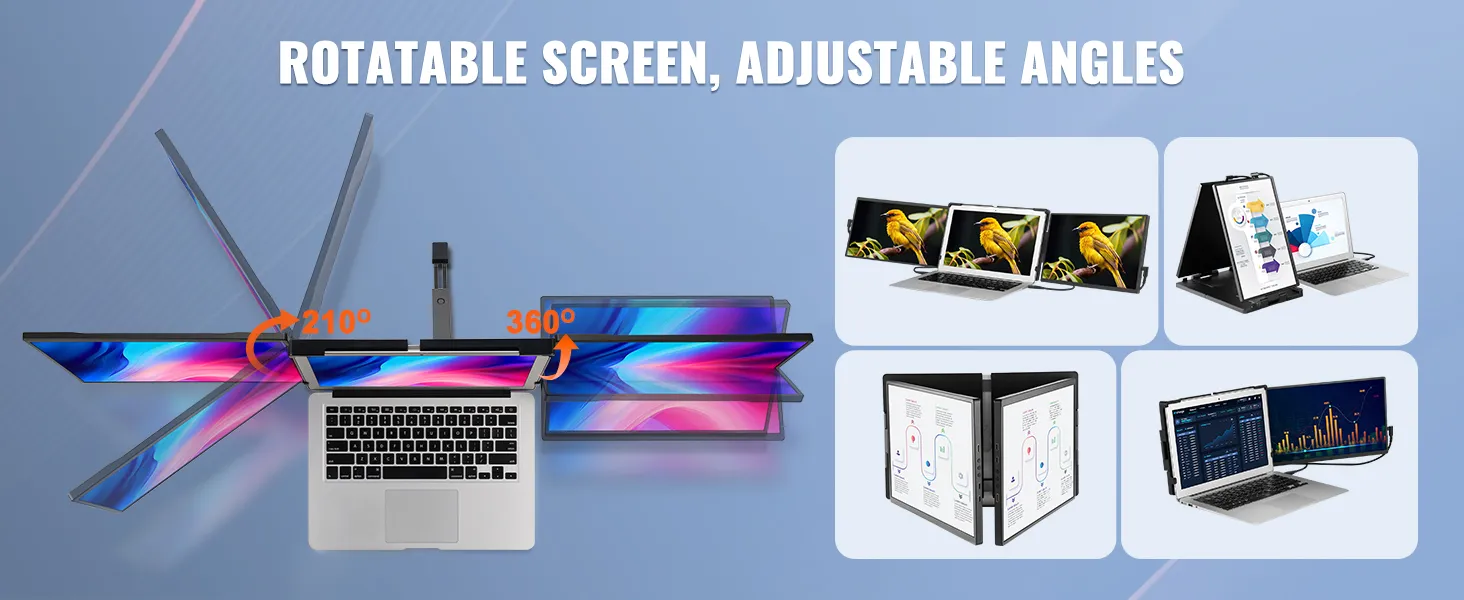 Veelzijdig: deze lichtgewicht schermverlengers kunnen rechtstreeks op uw laptop worden bevestigd en zorgen ervoor dat u overal met drie schermen kunt werken. Het scherm kan vrij worden gedraaid tot 210°, ideaal voor zakelijke bijeenkomsten, reizen, kantoorwerk, leren op afstand en entertainment. Met een gewicht van slechts 2 kg is hij gemakkelijk mee te nemen in een tas en is hij ideaal voor videoconferenties, kantoorpresentaties, huiswerk of zakenreizen.