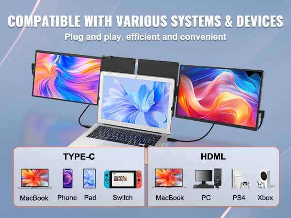 Brede compatibiliteit: deze draagbare monitorverlenger is compatibel met laptops van 13 tot 17 inch (330-432 mm), vereist geen installatie van stuurprogramma's en werkt met Android, Windows, Harmony OS en MAC OS. Het kan eenvoudig worden aangesloten op laptops en smartphones met Type-C-poort, Switch, PS4, Xbox en andere gaming-apparaten. Plug-and-play met USB-C-, USB-A- of HDMI-poorten; elke monitor heeft slechts een Type-C- of HDMI+USB-kabel nodig.