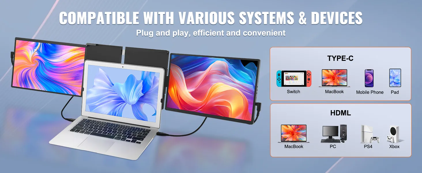 Compatibel met verschillende apparaten zoals Android, Windows, Harmony OS en MAC OS. Elk scherm wordt aangesloten via een enkele Type-C- of HDMI+USB-kabel, waardoor de installatie snel en eenvoudig is.