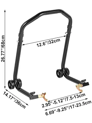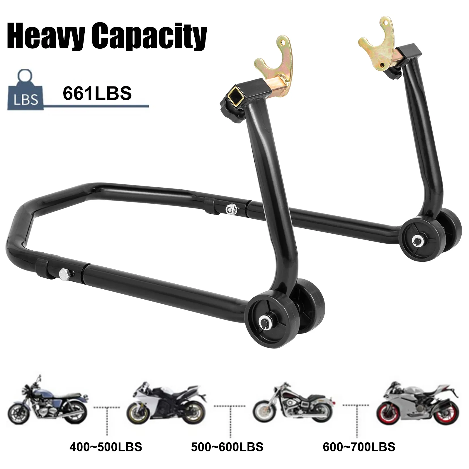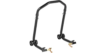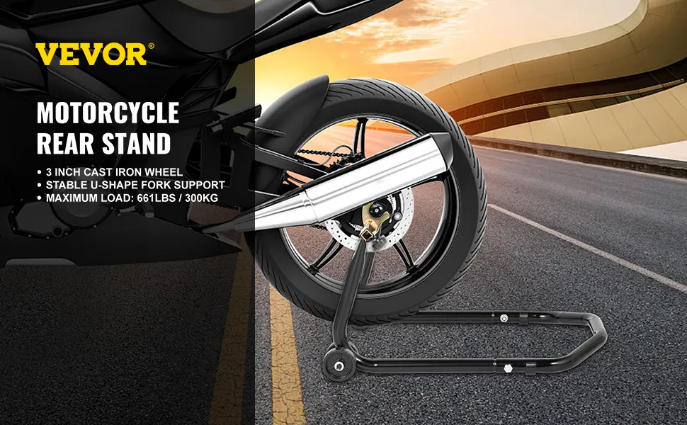 Met onze achtervorkstandaard kan het achterwiel eenvoudig en veilig worden opgetild voor reparatie, onderhoud en opslag. Extra zware ijzeren constructie betekent een lange levensduur en duurzaamheid onder alle omstandigheden. Onze motorstandaard is uitgerust met vier gietijzeren wielen, die een maximale belasting van 661 lbs kunnen dragen, waardoor de stabiliteit van verschillende terreinen behouden blijft.