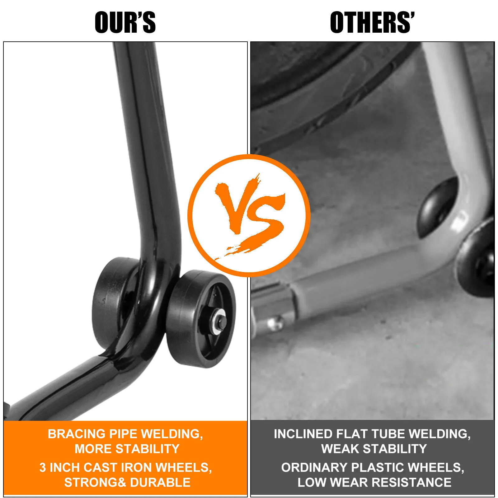 【4 GIETIJZEREN WIELEN】 - Onze paddockstand maakt gebruik van vier gietijzeren wielen met een afmeting van 3" om het gewicht te dragen, dat robuuster en duurzamer is dan plastic wielen en een langere levensduur heeft. Vier wielen bieden allerlei soorten stabiliteit van terrein.