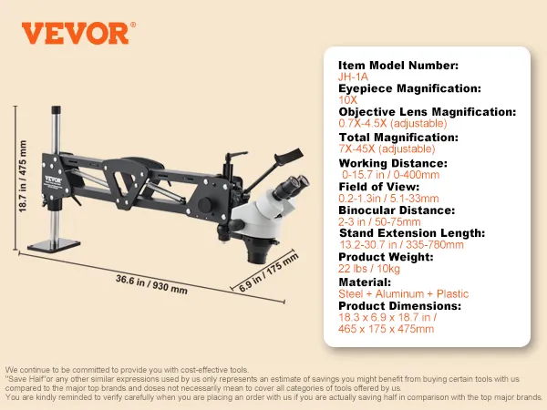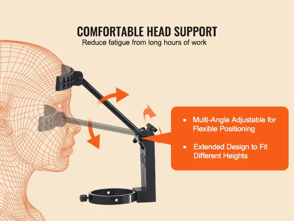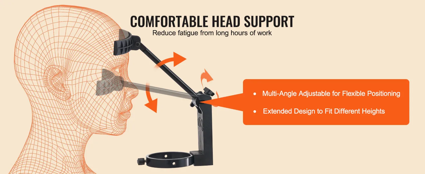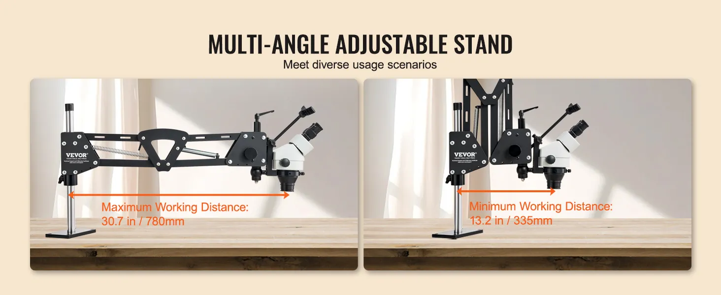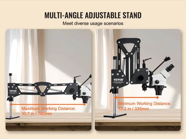 Reinforced Multi-Angle Adjustable Stand: The reinforced stand of the jewelers microscope can be adjusted up, down, left, right, forward, and backward. The stable structure helps reduce vibrations for precise observations. The maximum working distance is 30.7 inches / 780mm, and the minimum working distance is 13.2 inches / 335mm.