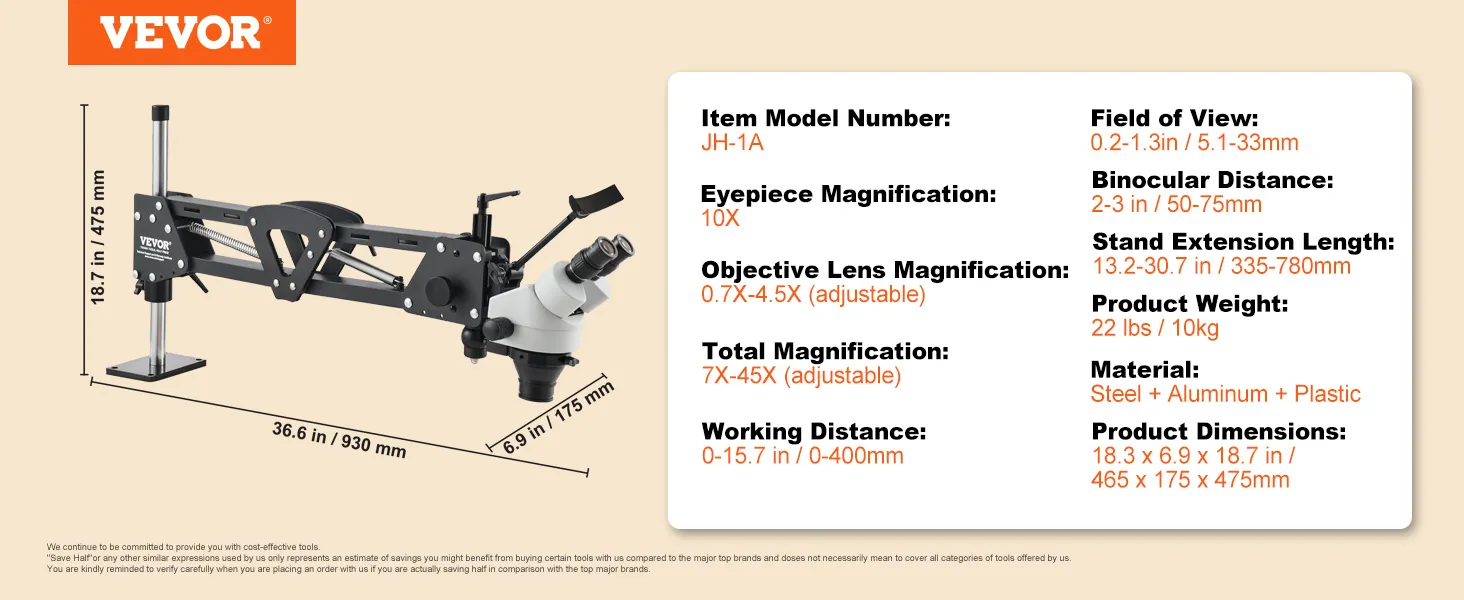 7X-45X Continuous Zoom: This jewelry microscope with spring bracket provides high-definition clarity and a wide field of view for your work. With a working height of 0-15.7 inches / 0-400mm, a field of view range of 0.2-1.3 inches / 5.1-33mm, and a lens ring of 3 inches / 77mm, it provides high clarity and strong stereoscopic effect.