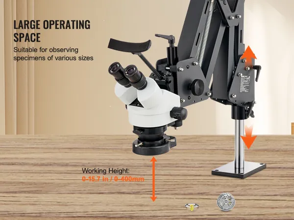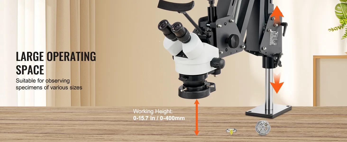 The 0-15.7 in / 0-400mm working height allows for observation of various sizes of specimens. You can flexibly apply this jewelers microscope to different workbenches, stands, or other installation positions without the need to adjust the height of the workbench.