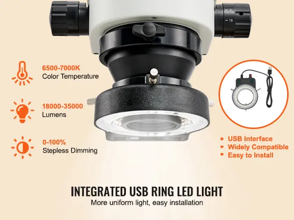 With 144 LED lights providing ample lighting, a color temperature of 6500-7000K, and 18000-35000 lumens, the microscope jewelry inlaid stand supports 0-100% stepless dimming. The integrated LED ring light with a USB interface is widely applicable and easy to install.