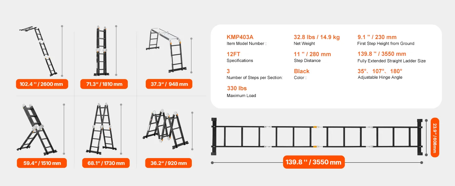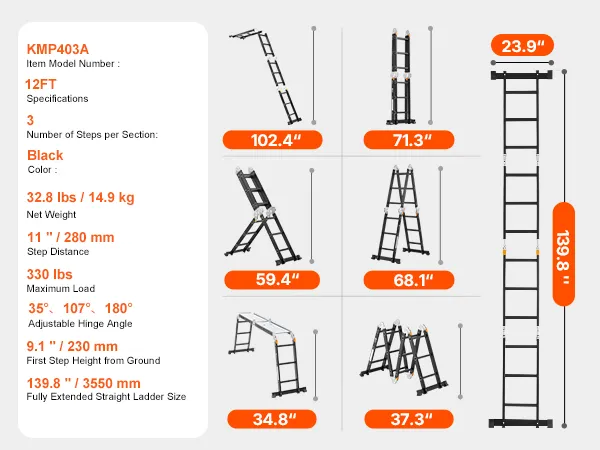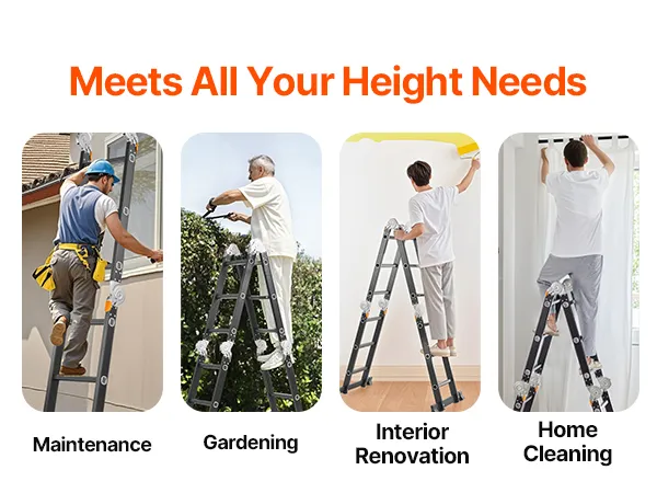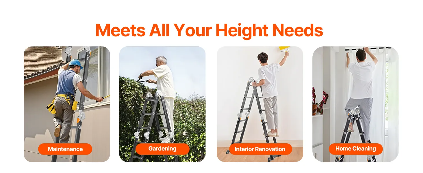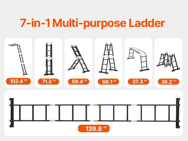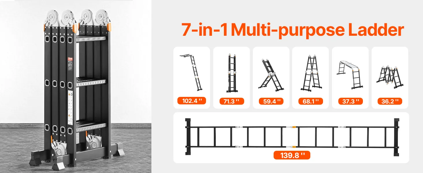7-in-1 veelzijdigheid: deze verstelbare ladder kan in 7 vormen worden opgevouwen: A-frame, M-frame, ladder, L-vorm, platform, gevouwen en recht. Het is ideaal voor het schoonmaken van huizen, onderhoud, renovatie, tuinieren, autowassen en meer. Hij kan worden uitgeschoven tot 3550 mm (139,8 inch) voor gemakkelijke toegang tot daken. Bovendien wordt hij geleverd met twee steigerplatforms voor extra veiligheid en veelzijdigheid tijdens gebruik.