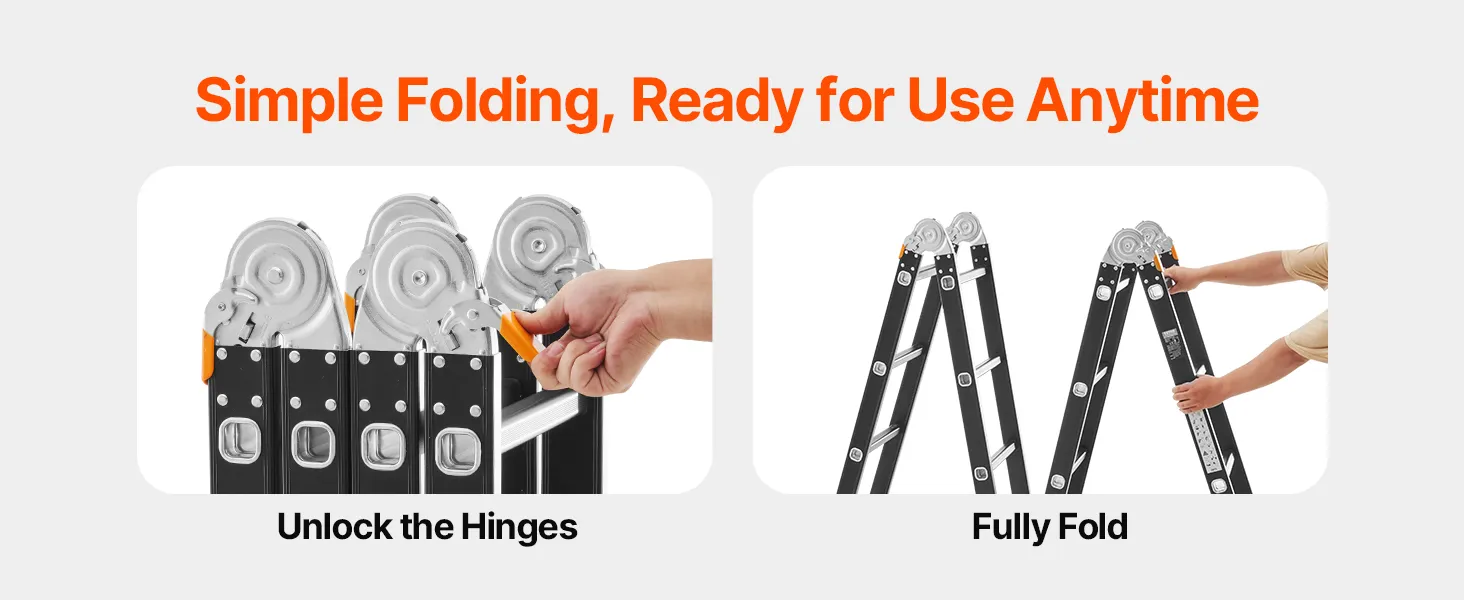 Lichtgewicht en gemakkelijk op te bergen: met een gewicht van slechts 14,4 kg is deze ladder gemakkelijk te dragen en te verplaatsen. Wanneer hij volledig is opgevouwen, kan hij gemakkelijk in elke hoek worden opgeborgen om ruimte te besparen.
