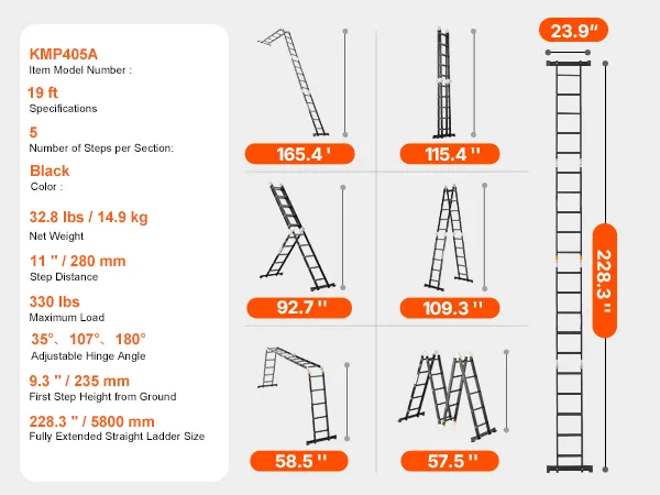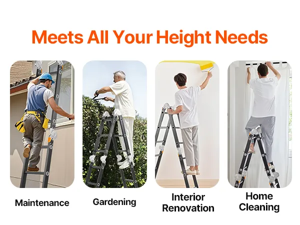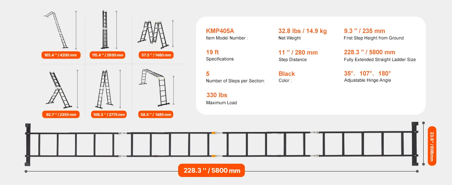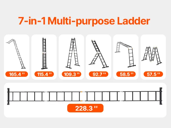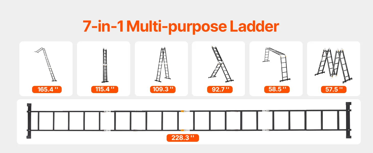 7 in 1 veelzijdigheid: deze verstelbare ladder kan eenvoudig in 7 verschillende vormen worden opgevouwen: A-frame, M-frame, ladder, L-vorm, platform, gevouwen en recht. Het is perfect voor verschillende taken, zoals het schoonmaken van huizen, onderhoud, interieurontwerp, tuinieren, autowassen en meer. Hij kan tot 5800 mm (228,3 inch) worden uitgeschoven, waardoor u gemakkelijk daken of hoge plaatsen kunt bereiken.