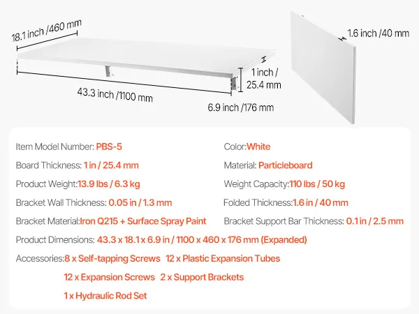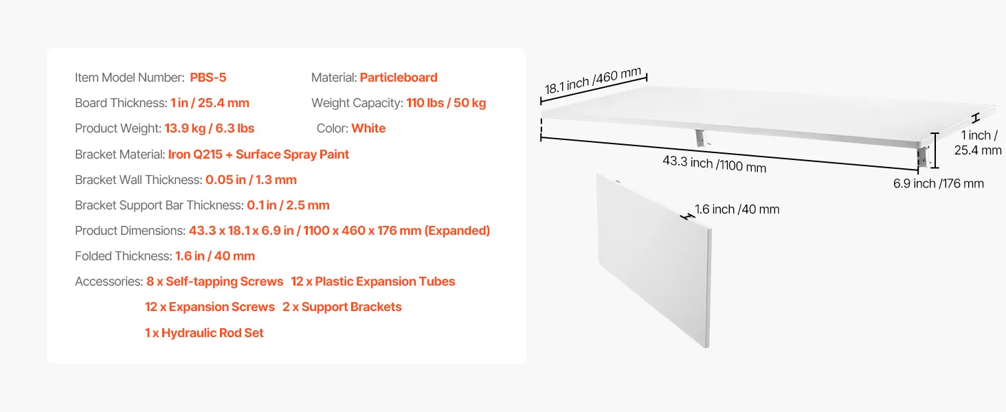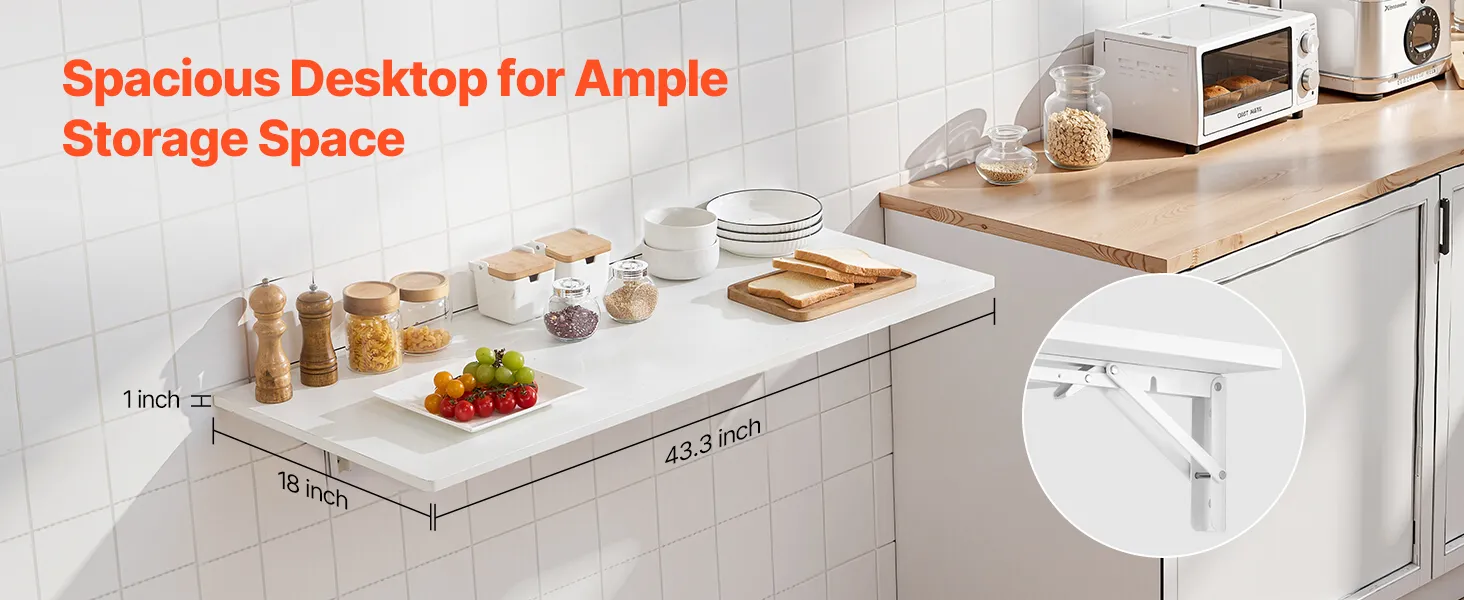 VEVOR Wall Mounted Folding Table, 43.3 x 18 inches Wall Mount Table, Floating Desk with Iron Bracket, Fold Down Desk for Small Spaces, Home Office, Dining, Laundry Room, Kitchen, Bar, White