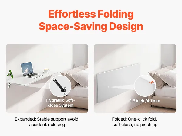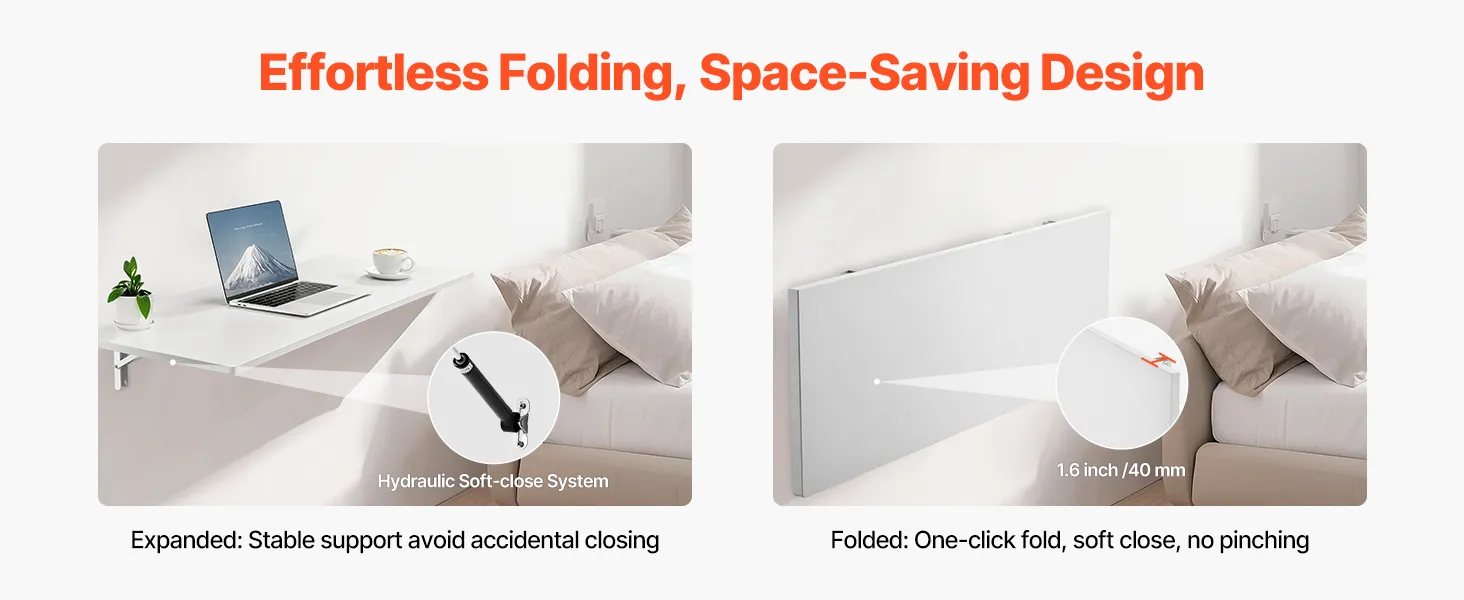 One-touch Folding: Simply press a button to fold the wall mounted table, saving 1.6 inches of space when not in use. The hydraulic mechanism ensures smooth, secure closing, so no more pinched fingers—just pure convenience