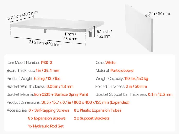 VEVOR Wall Mounted Folding Table, 31.5 x 15.7 inches Wall Mount Table, Floating Desk with Iron Bracket, Fold Down Desk for Small Spaces, Home Office, Dining, Laundry Room, Kitchen, Bar, White
