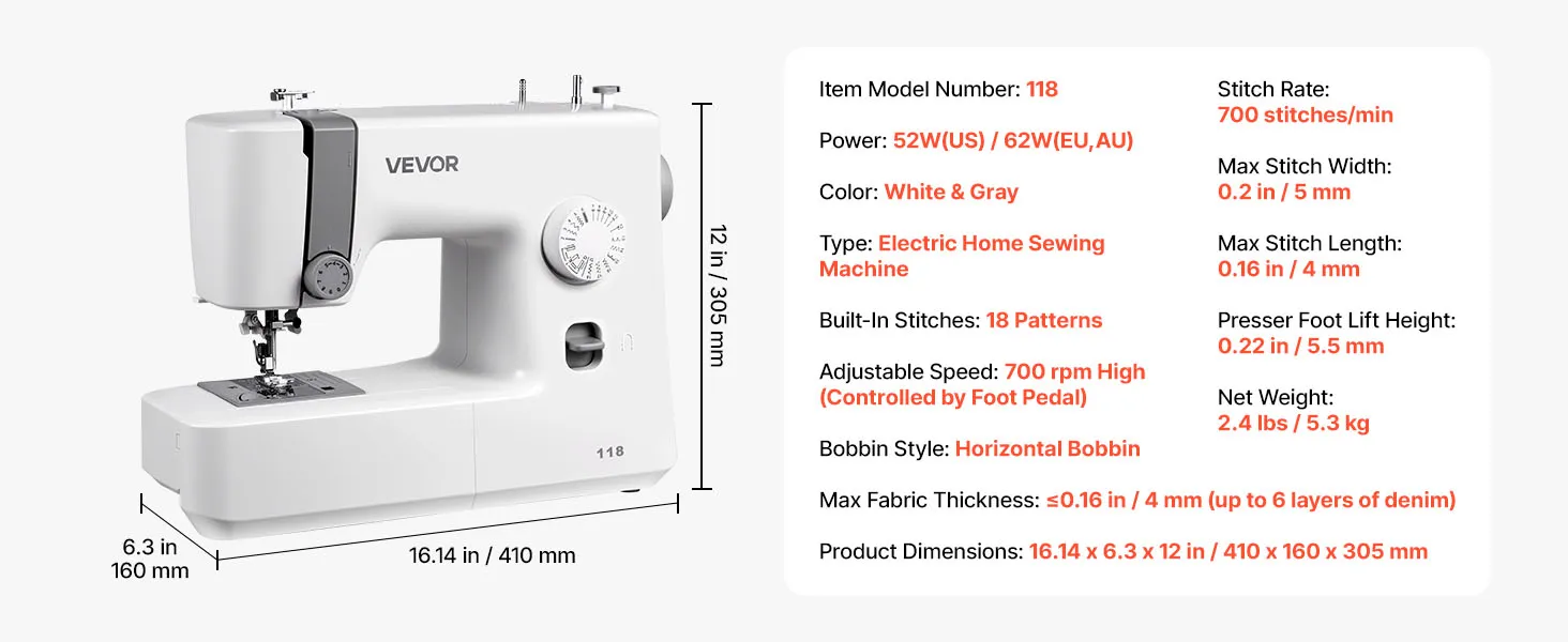 Eenvoudige bediening: De vooraf ingestelde naaldpositie, steeklengte en steekbreedte besparen tijd bij het instellen. De instelbare draadspanning en de geïntegreerde automatische naaldinrijger vereenvoudigen de bediening. Deze naaimachine is ideaal voor beginners en gebruikers die op zoek zijn naar efficiëntie.