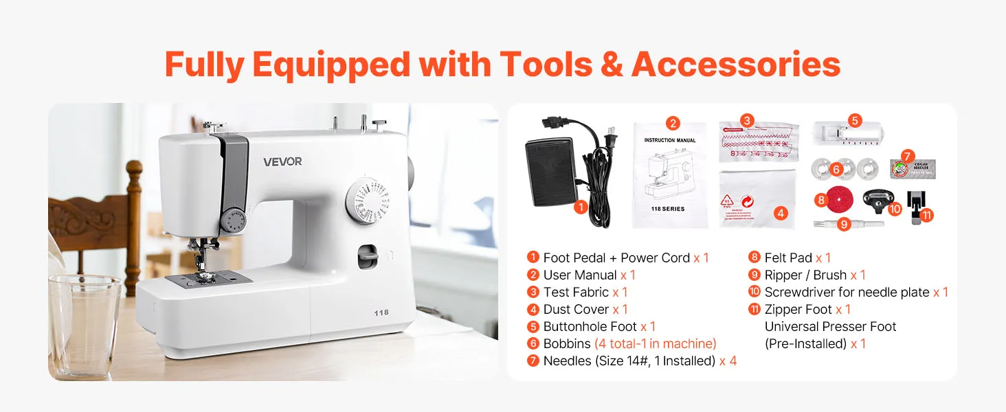 Onze snelle naaimachineset bevat essentiële naaivoeten, naaiaccessoires zoals naalden en transparante spoeltjes, en praktische hulpmiddelen zoals een viltmat en teststof. Alles wat je nodig hebt voor diverse naaiprojecten, van materialen tot onderhoudsgereedschap.