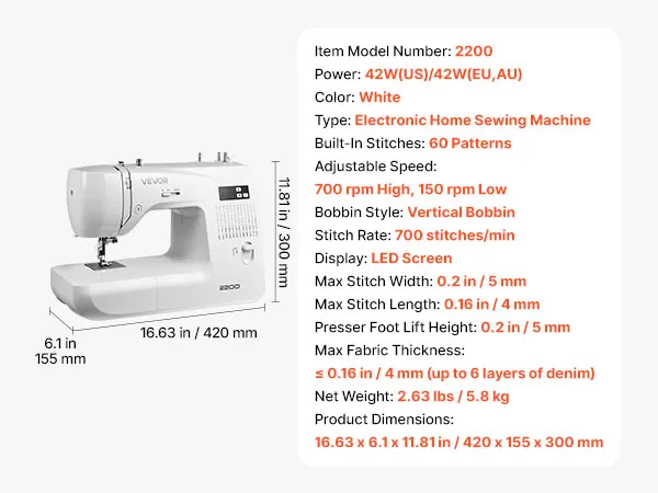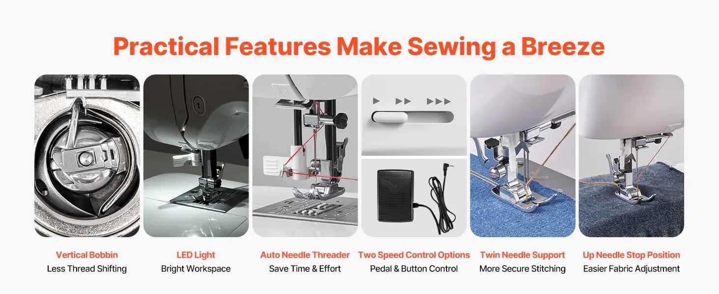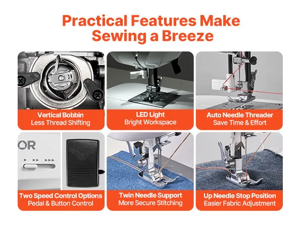 Praktisch ontwerp: Deze snelle naaimachine maakt gebruik van een verticaal oscillerende haak om draadopstoppingen te minimaliseren. Hij ondersteunt naaien met dubbele naald voor sterkere naden. De ingebouwde led-lamp verlicht het naaigebied, waardoor schaduwen en oogvermoeidheid worden verminderd.
