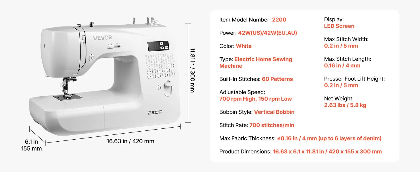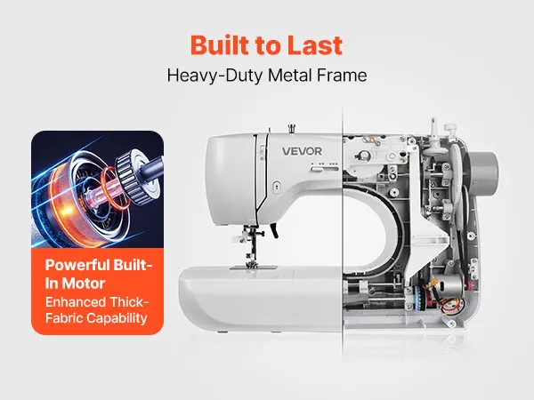 Geschikt voor dikke stoffen: Uitgerust met een stevig metalen frame, een roestvrijstalen bed en een krachtige motor, naait onze digitale naaimachine stoffen tot 0,16 inch (ongeveer 4 mm) dik - zoals 6 lagen denim - en kan moeiteloos zowel dunne chiffon als dikke jeans verwerken