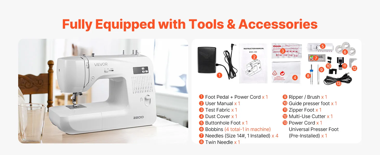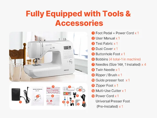 Onze elektrische naaimachineset bevat essentiële naaivoeten, naaiaccessoires zoals naalden en transparante spoeltjes, en praktische hulpmiddelen zoals een viltmat en teststof. Alles wat je nodig hebt voor diverse naaiprojecten, van materialen tot onderhoudsgereedschap.
