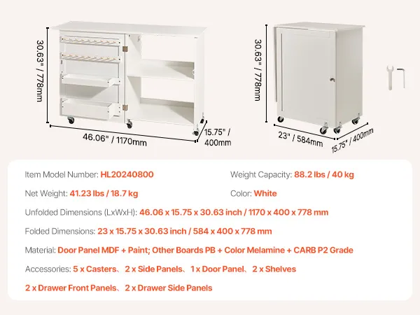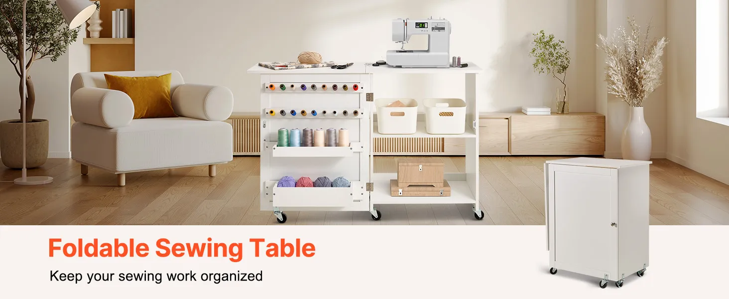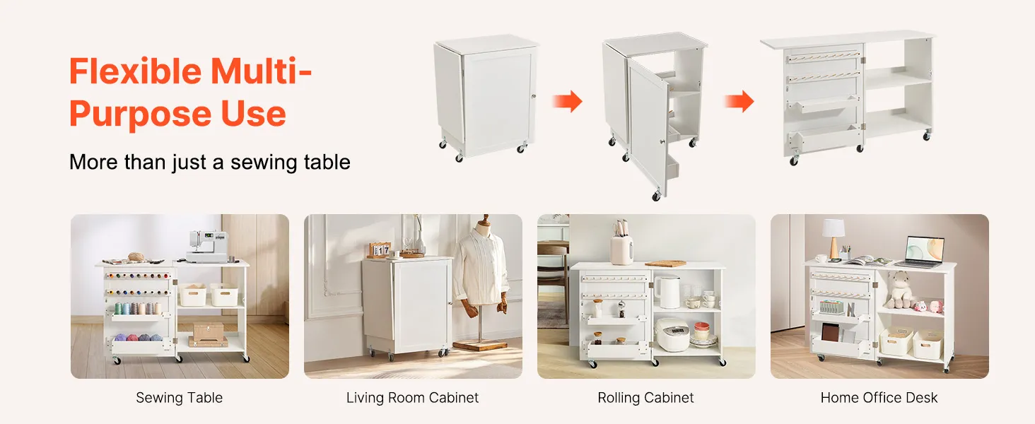 When you need to get to work, simply unfold the tabletop to use the sewing desk as a sewing or office desk. When not in use, fold it up and store it as a convenient storage cabinet for your everyday items.