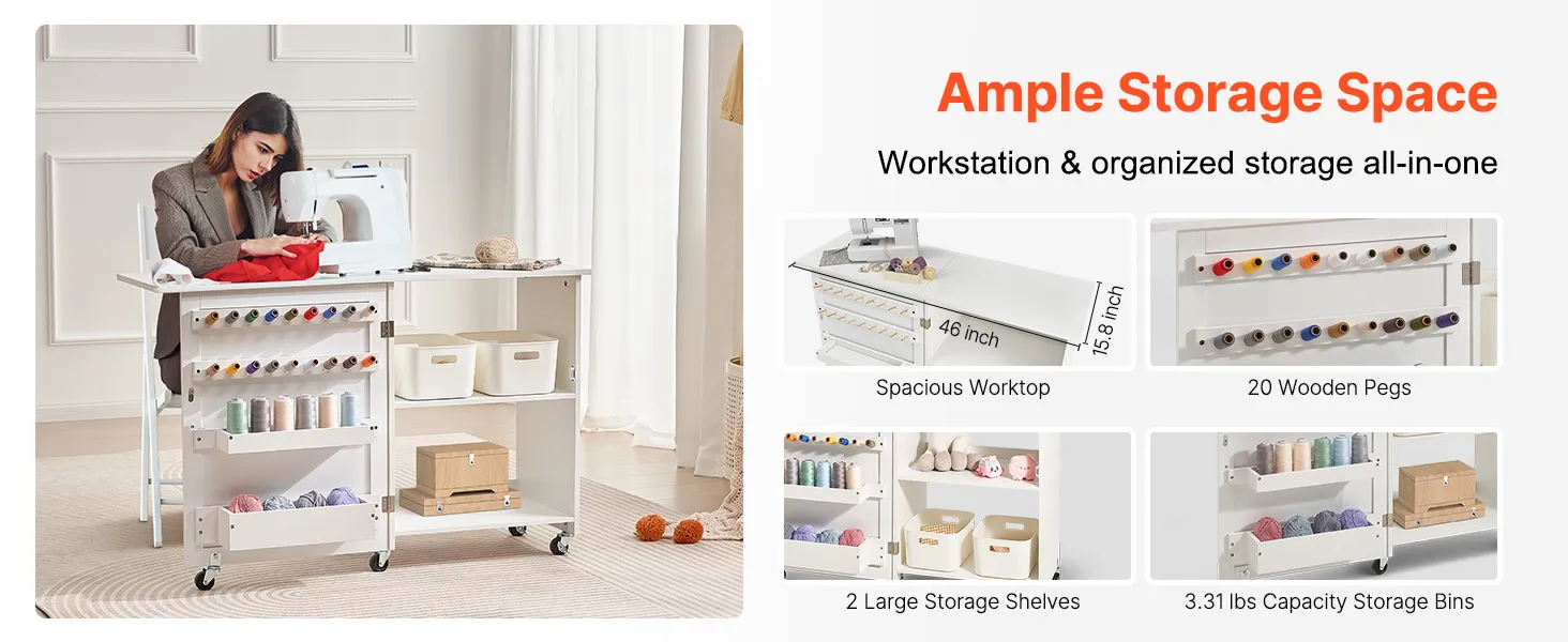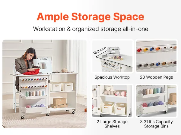 With an expanded tabletop of 46" x 15.8", this sewing table provides ample space for sewing and cutting fabrics simultaneously. Multiple storage compartments ensure that all your tools and accessories are within easy reach and neatly organized.