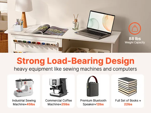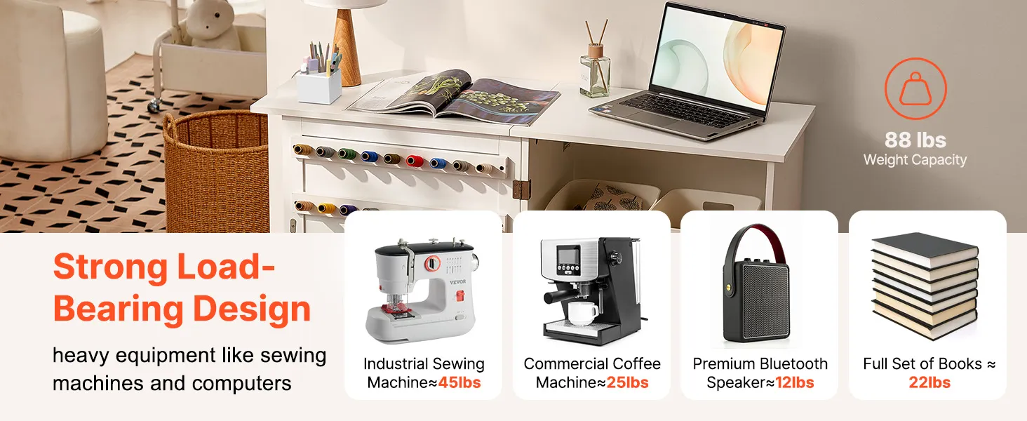 This sewing table with storage features a solid 88 lbs weight capacity, making it reliable for holding larger sewing machines and supplies without worrying about instability. Additionally, the set includes two external storage trays with 3.31 lbs weight capacity.