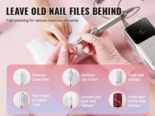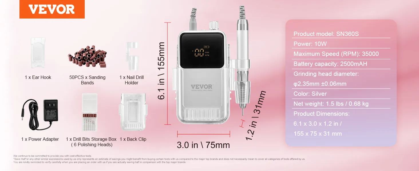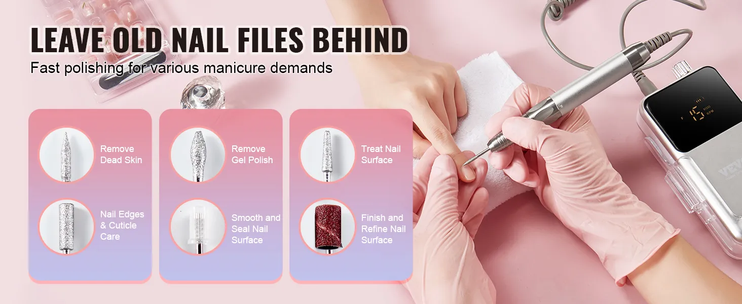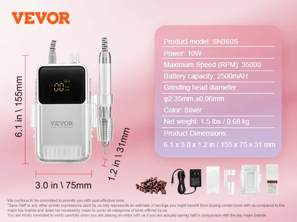 De VEVOR elektrische accu-nagelvijl wordt compleet geleverd met 6 schuuropzetstukken en 50 schuurbanden en biedt alles wat je nodig hebt om dode huidcellen te verwijderen, gellak aan te brengen en nageloppervlakken perfect te verfijnen.