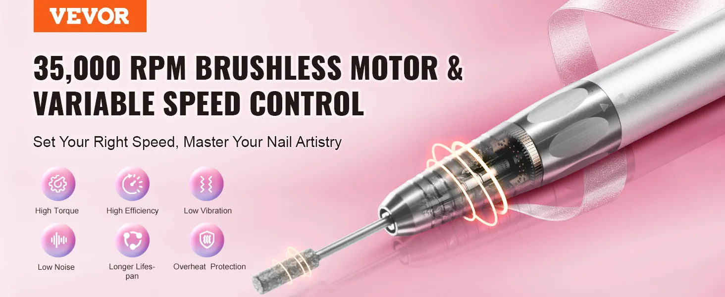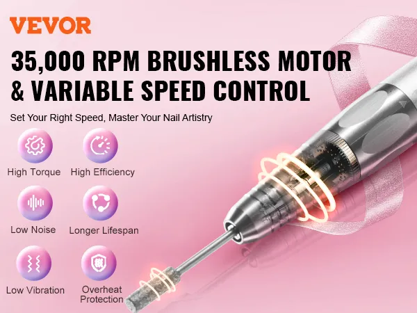 BORSTELLOZE MOTOR MET HOOG KOPPEL, 35.000 RPM: De VEVOR accu-spijkerboormachine is uitgerust met een snelle borstelloze motor die snelheden tot 35.000 RPM bereikt. Ervaar een grotere efficiëntie, minder trillingen, een stillere werking en variabele snelheidsregeling. Pas de snelheid van de nagelboor aan volgens uw verschillende behoeften.